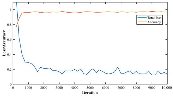 The pre-trained Mask R-CNN weight was inherited from the COCO dataset and the backbone network was ResNet101 + FPN. The number of categories was 2 (background and weld). The model output the category scores, bounding boxes and masks of weld seams for each input image after training. The training parameters were set as follows: the initial learning rate of the network was 0.001; the weight attenuation coefficient was 0.0005; the momentum coefficient was 0.85. During the deep learning training process of the weld seam dataset, the loss function and accuracy curve changes as shown in Figure 7. After 10,000 iterations, the training loss function curve stabilizes at 0.15–0.2, and the accuracy of the network model is greater than 0.97. Comparing the learning effect of 3000, 5000 and 8000 iterations, due to smaller weld images and the number of categories is only 2, the effect after 3000 iterations is already good and after 5000 times is basically stable.