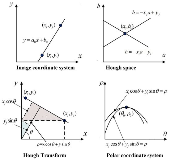 Each line in the image space can be described as a point in the Hough space. As shown in Figure 9, point and point correspond to two straight lines in Hough space, respectively:
