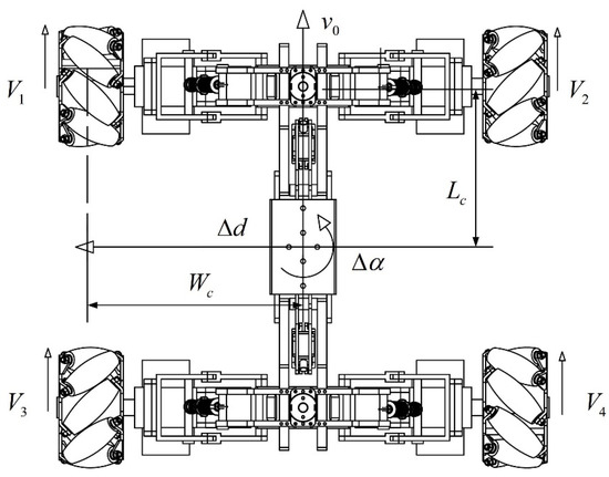 As shown in Figure 10, assuming that the robot forward velocity is , the rotation angular velocity and lateral velocity to be adjusted are and , respectively. Then the inverse kinematics equation of tracking movement is: