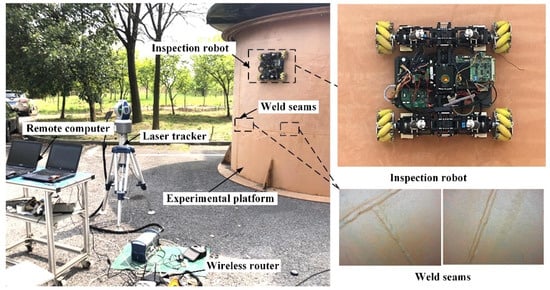 As shown in Figure 11, the experimental platform is a cylindrical tank with a diameter of 4000 mm, a height of 2800 mm and a thickness of 10 mm. Weld seams are distributed on the surface of the experimental tank for identification and tracking by the robot. The laser tracker was used to record the running position of the inspection robot.