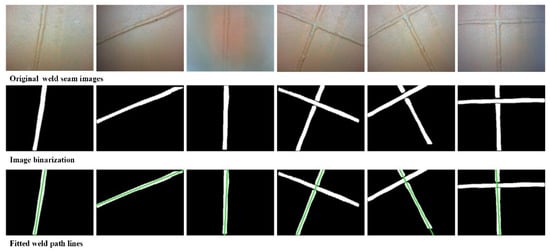 Image binarization and fitting results of weld paths by the robot. Note: The binarized seam path images are convenient for processing and path line fitting.
