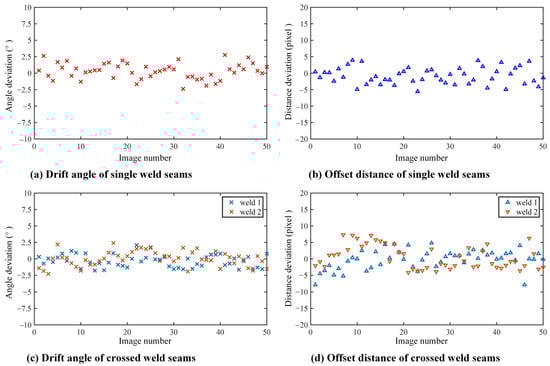Figure 15 shows the deviations between the calculated values and the actual measured value of drift angle and offset distance . In deviation values of single weld seams, the average deviation of drift angle between calculated paths and actual paths is 1.01°, and the maximum deviation is 2.78° (Figure 15a). The average deviation of offset distance is 2.21 pixels, and the maximum value is 5.57 pixels (Figure 15b). In terms of the deviation of crossed weld seams, the average and maximum deviations of drift angle are about 0.87° and 2.37° (Figure 15c), and the average and maximum deviations of offset distance are 2.62 pixels and 7.83 pixels (Figure 15d). These deviations are generally kept at small values which have little effect on the weld path tracking by the robot.