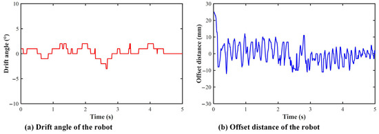 Figure 16 shows the drift angles and offset distances of robot while tracking the identified weld seams. The robot can successfully correct its angle and velocities to track weld seams. The maximum drift angle and offset distance were about 3° and 10 mm, respectively. The accuracy of tracking weld seams could meet the operational requirements of the inspection robot.
