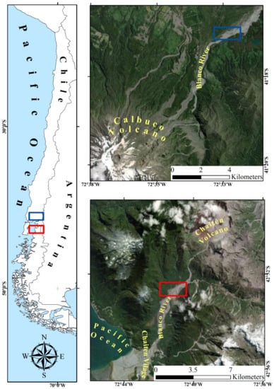 Study area locations in Chile (left), and the specific location of Blanco Este River (top-right) and Blanco River (bottom right) (modified after []).