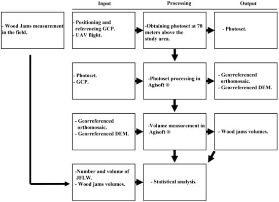 Workflow detailing each stage of the methodological process, the necessary input, the processing, and their outputs. Keywords: GCP (ground control points), UAV (unmanned aerial vehicle), Photoset (set of images obtained from the UAV flight), DEM (digital elevation model), Orthomosaic (mosaic built from the photoset), JFLW (jams forming logs) (modified after []).