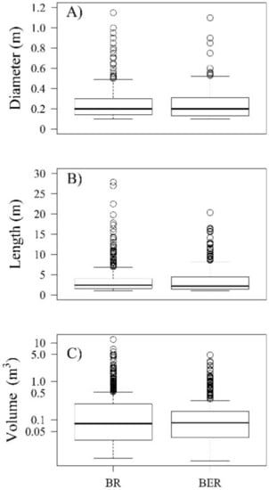 All the wood jams located into the study reaches were considered. In BR, 37 WJs were detected and measured. These WJ were composed of 522 JFLWs, as already presented in []. On the other hand, along the BER, 45 WJ were found, composed of 382 JFLW that were measured in the field. Considering both datasets (i.e., BR and BER), differences in the diameter (Table 1A; Figure 4A), length (Table 1A; Figure 4B), and volume (Table 1; Figure 4C) of each JFLW were not statistically significant (MW test), with p-values = 0.41, 0.10, and 0.58, respectively.