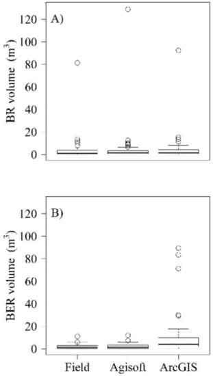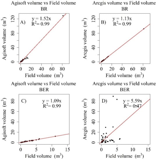 Considering then the BER, interesting differences appeared using the different approaches (Figure 6). In fact, clear differences in performance can be ascribed to the different approach applied for WJ volume computation. The Agisoft approach also shows in this case a statistically significant linear correlation (MW test < 5%), generating an overestimation of approximately 12.3% with respect to field observation. On the contrary, the application of the ArcGIS approach does not work precisely even if maintaining a positive correlation. In this case, there is an overestimation of approximately 446.73%, with respect to field results.