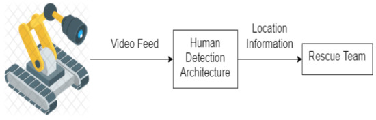 The idea is to enable multiple robots to traverse and navigate through the calamity site and examine it for prospective survivors. The robot will also be responsible for identifying the prospective dangers for the rescue workers. It will have an air-quality detector embedded which is responsible for analyzing the quality of the air at the calamity site. Hence, if the surrounding air is not safe for rescue workers, it will signal an alert. The robot will be equipped with a camera and microphone that will record a live stream and the underlying human detection architecture will determine if there is a human survivor or not in the current video frame in real time. In case a survivor is located, the robot will instantly transmit the location coordinate to a centralized cloud server which will be continuously monitored manually for any inputs. The system should work as indicated in Figure 1: