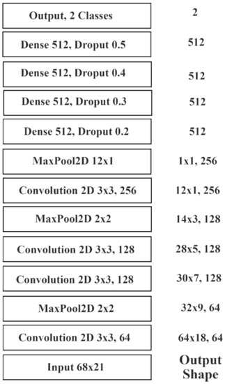 The CNN input is made up of patches with a size of (time–feature dimension) and a 695 ms input processing window. There are four convolutional layers and four thick layers in the model. A batch-normalization stage and ReLU activation layers follow all of these levels. Dropout layers follow the dense layers, and as the depth of the network increases, the dropout rates increase. The first convolutional layer has the maximum width to capture the horizontal patterns commonly present in music signals. On the other hand, the last pooling layer works on the temporal dimension, focusing on the pattern with the most activation across this rather long time span. A softmax activation layer is used to implement the output and the probability is predicted.