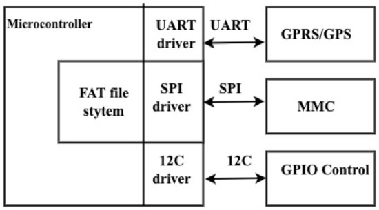 As illustrated in Figure 7, the GPS tracking module is based on an AVR RISC microcontroller and several peripheral devices. The RISC microcontroller is an 8-bit low power microcontroller that contains 32k ROM and 2k RAM. The peripheral devices include UART (connects to GPRS/GPS Module), SPI (connects to MMC Module), and I2C (connects to GPIO Control Module). The GPS function is used to detect the device’s location. The GPS function then broadcasts the recorded location to the server. The SPI is used to connect to the MMC module in case of connectivity failure or for backup. The MMC module can store location data until the connection is re-established [22].
