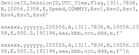 The geo-tracking firmware is developed and compiled by using the AVR compiler. It works in three phases. The first phase is called initialization. In this phase, the module is initialized and it becomes ready to detect and transmit the location coordinates. This is followed by GPS location reading in which the microcontroller invokes the GPRS/GPS module via a series of AT commands through the UART interface. The third and final phase is data formatting and transmission to the geo-tracking server. The NMEA data are converted to the format specified in Figure 8 and kept as packets. The samples are then grouped together and sent to the geo-server [22].