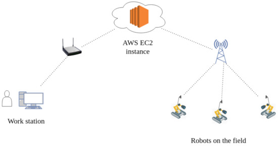 Here, in Figure 12, we have proposed an example of how communication can be achieved between the robots, the base station, and an AWS EC2 (Elastic Compute) instance. The AI model can be deployed on this instance with our web service. The robots can send the audio and video files by leveraging REST APIs.