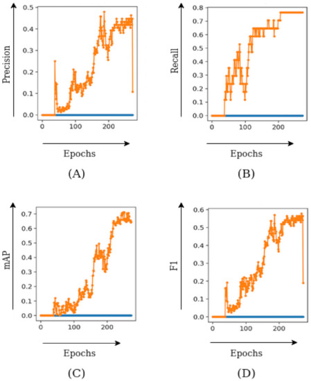 Performance of the video detection model is depicted in this figure. (A) Precision vs. Epoch. (B) Recall vs. Epoch. (C) mAP vs. Epoch. (D) F1 score vs. Epoch.
