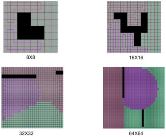 To analyze the performance of DARP, we ran a simulation with three robots in four different environments of sizes 8 × 8, 16 × 16, 32 × 32, and 64 × 64 and some obstacles in between. The metrics we analyzed were the average percentage of the cells that will be covered by a particular robot, the average no. of turns that robots need to make to cover the entire grid, and the total execution time for running the simulation. The simulations were performed on a computer with 8 GiB of RAM and an Intel(R) Core(TM) i7-8550U CPU @ 1.80 GHz processor. Table 8 and Figure 17 compare the performance of DARP in different environments.