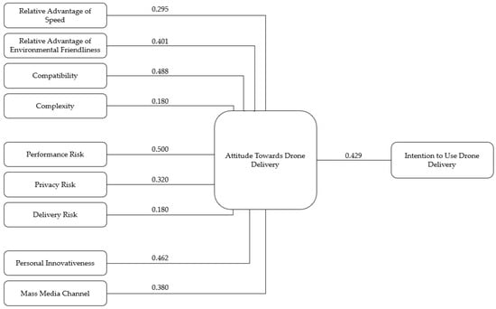 In the literature, it has been proposed and proven that attitude influences behavioral intentions, which is based on the ideas in the TAM. Consequently, behavioral intentions measure the probability of performing a certain action, such as adopting a technology [32]. Attitude refers to a person’s positive or negative evaluation of a behavior, which has a direct effect on their intention to use [51]. In the case of drones, attitude is the negative or positive evaluation of their delivery service [31]. Based on this, the following hypothesis is presented:
