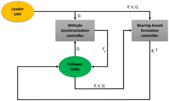 - A novel cascaded approach for distributed formation control of quadcopter UAVs was presented, consisting of an undirected bearing-based controller and a quaternion-based attitude synchronization controller working together in unison.