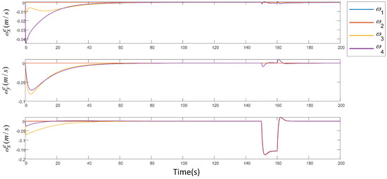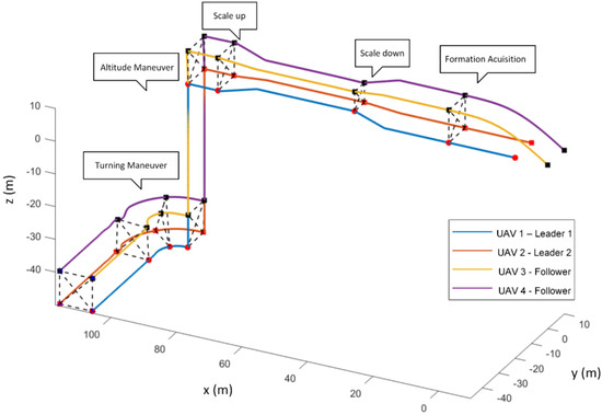 - Results: after the scaling operation while translating in the x-axis direction, the formation abruptly descended its altitude in the z-axis direction in 3D space at t = 100 to 110 s by altering the velocity of leaders. The trajectory plot of UAVs is given in Figure 5, and the formation tracking error converged to zero asymptotically as shown in Figure 6 (highlighted with grey color).