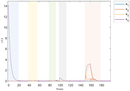 - Results: the target formation formed a designated square shape and was attained by implementing pre-defined bearing constraints between the agents as , , , , , , , , , and . The formation trajectories are given in Figure 5. The formation tracking error is shown in Figure 6 (section highlighted in blue), which asymptotically converged to zero from t = 0 to 20 s.