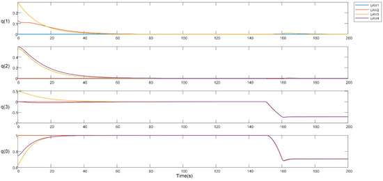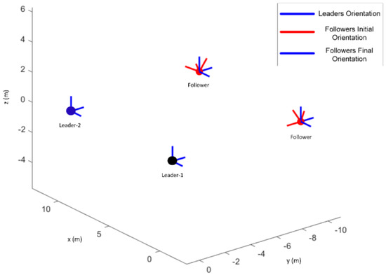 - The distributed attitude synchronization and bearing-based formation control law were designed for 3D formation control as compared to [22,23], which have only designed bearing-based controllers for 2D space. Moreover, the proposed scheme uses quaternion-based attitude control, which is much more robust than research that has used Euler angles such as [21,31].