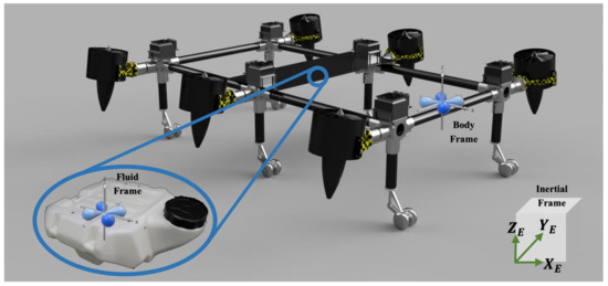 The multirotor under investigation through this research is called Fan Hopper; this platform has several complexities, from mechanical design to control algorithms, practical flight tests, and aerodynamic amendments. As shown in Figure 2, the drone has six EFDs installed inclined, varying the incident angle from 0° (vertical) to 22°, to maintain both thrust and cancel the yaw moment produced by each engine. This phenomenon occurs when all rotors rotate in the same direction, as in our investigation. Considering the geometry of EDFs, the yaw moment produced by each engine is minuscule but not zero; therefore, installing motors with an incident angle is an ingenious solution to control this small amount. The system is led by an open source autopilot (Pixhawk Cube), which allows development of the guidance loop (upper controller loop) using special plugins, which are described further in Section 4. Furthermore, the system contains a fluid payload tank under its CoG up to 20 kg weight that is dynamically modeled in Section 3.