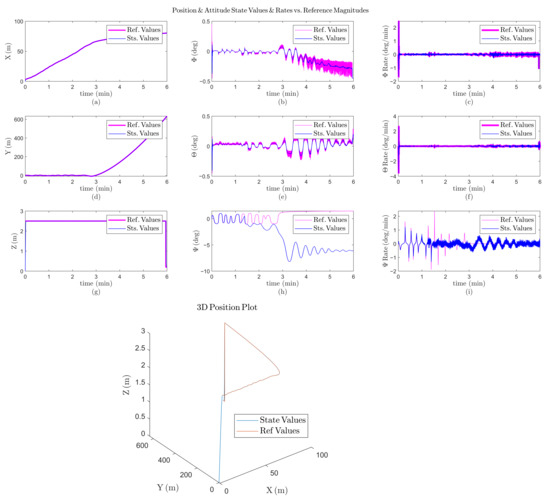 Simulation results when an EDF fails during 5 min; (a) the horizontal (x) position variation versus time; (b) the roll () angle variation versus time; (c) the roll rate () variation versus time; (d) the horizontal (y) position variation versus time; (e) the pitch () angle variation versus time; (f) the pitch rate () variation versus time; (g) the vertical (z) position variation versus time; (h) the yaw () angle variation versus time; (i) the yaw rate () variation versus time.
