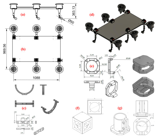 The CAD models of the Fan Hopper; (a) side elevation of the CAD model; (b) top view of the CAD model; (c) engine arm connectors; (d) a 3D view of the CAD model; (e) incident angle adjusters for duct engines; (f) the conjunction main connector; (g) body to duct arm connectors.