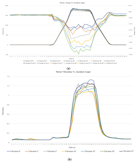 Diagram of an EDF data versus incident angles (0°–22°) during 30 s; (a) diagram of EDF thrust and yawing torque, (left bar) thrust values, (right bar) torque values; (b) the expressed vibration impact of distinct incident angles on the duct.