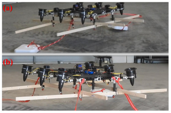 Ground tests made to assure the stability of Fan Hopper, and examine the lifting power; (a) lifting two payloads of 5 kg; (b) lifting four payloads of 5 kg.