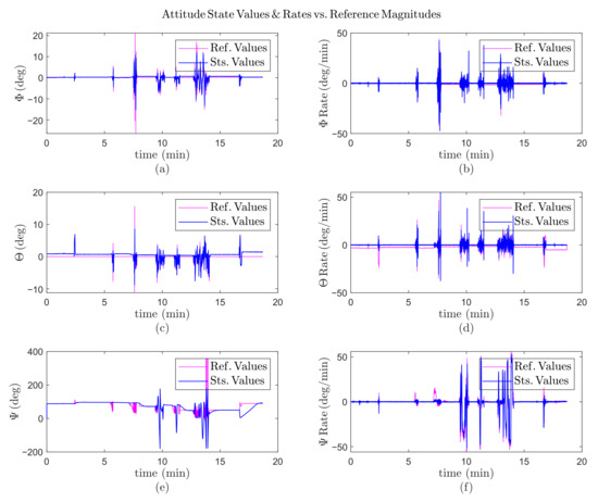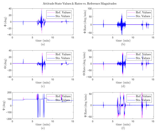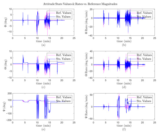 Practical results with an EDF failure, during 22 min; (a) the roll () angle variation versus time; (b) the pitch () angle variation versus time; (c) the yaw () angle variation versus time; (d) the roll rate () variation versus time; (e) the pitch rate () variation versus time; (f) the yaw rate () variation versus time.