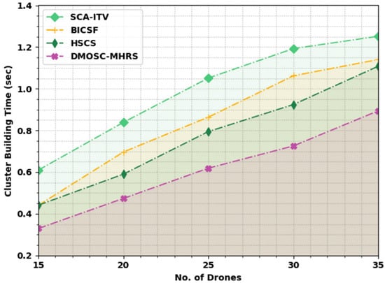 Table 1 and Figure 2 highlight the cluster building time (CBT) of the DMOSC-MHRS approach under varying drones with existing methods such as the hybrid self-organized clustering scheme (HSCS), bio-inspired clustering scheme for FANET (BICSF), and SCA-ITV [22]. The experimental values indicated that the DMOSC-MHRS algorithm has demonstrated enhanced results under all drones. For example, with 15 drones, the DMOSC-MHRS model offered a lower CBT of 0.33 s whereas the SCA-ITV, BICSF, and HSCS algorithms obtained higher CBT of 0.61 s, 0.44 s, and 0.44 s, correspondingly. In line, with 20 drones, the DMOSC-MHRS approach presented a lower CBT of 0.47 s whereas the SCA-ITV, BICSF, and HSCS methods acquired higher CBT of 0.84 s, 0.70 s, and 0.59 s, correspondingly. Along with 25 drones, the DMOSC-MHRS technique has presented a lower CBT of 0.62 s whereas the SCA-ITV, BICSF, and HSCS algorithms gained higher CBT of 1.05 s, 0.86 s, and 0.79 s, correspondingly.