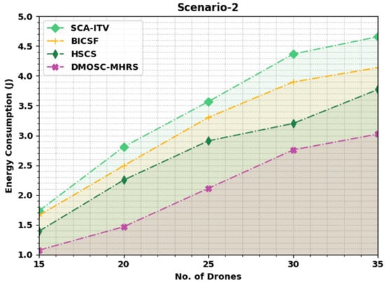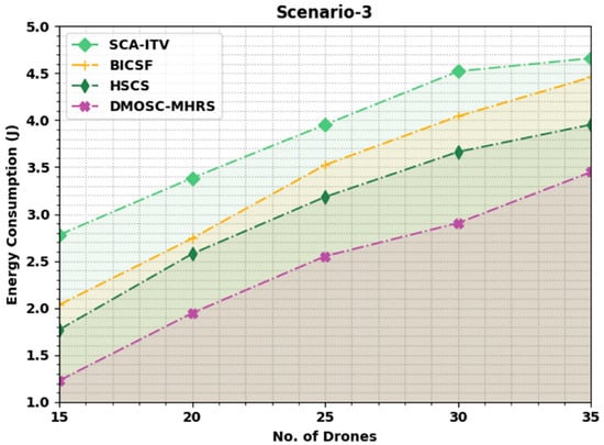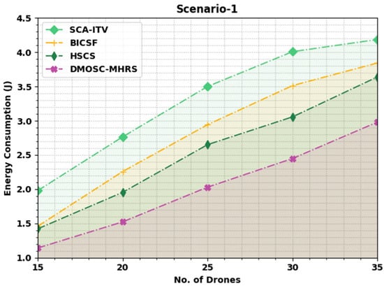 Figure 5 reports a comprehensive ECM assessment of the DMOSC-MHRS approach with existing models on Scenario-3. The figure representing the DMOSC-MHRS technique exhibits enhanced results with minimal ECM values. For example, with 15 drones, the DMOSC-MHRS model gained the least ECM of 1.23 J whereas the SCA-ITV, BICSF, and HSCS approaches reached higher ECM of 2.78 J, 2.03 J, and 1.77 J, correspondingly. Concurrently, with 20 drones, the DMOSC-MHRS approach attained the least ECM of 1.95 J whereas the SCA-ITV, BICSF, and HSCS methodologies obtained higher ECM of 3.38 J, 2.74 J, and 2.58 J, correspondingly. Similarly, with 25 drones, the DMOSC-MHRS model gained the least ECM of 2.55 J whereas the SCA-ITV, BICSF, and HSCS approaches reached higher ECM of 3.95 J, 3.52 J, and 23.18 J, correspondingly.