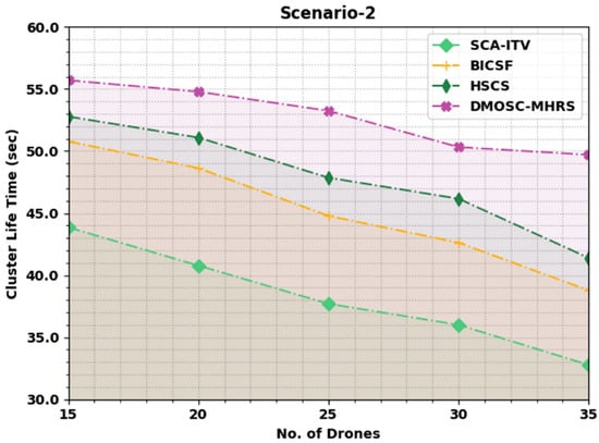 A comprehensive cluster lifetime (CLT) inspection of the DMOSC-MHRS model with other models is performed on different scenarios in Table 3. Figure 6 performs a comparative analysis of the DMOSC-MHRS technique with recent models in Scenario-1. The figure highlights that the DMOSC-MHRS algorithm displays enhanced performance with maximal CLT values under all drones. For example, with 15 drones, the DMOSC-MHRS methodology attained enhanced results with improved CLT of 52.34 s whereas the SCA-ITV, BICSF, and HSCS models obtained reduced CLT of 36.73 s, 46.37 s, and 48.67 s, respectively. Also, with 25 drones, the DMOSC-MHRS approach reached enhanced results with improved CLT of 50.35 s whereas the SCA-ITV, BICSF, and HSCS approaches gained reduced CLT of 32.60 s, 40.41 s, and 44.54 s, correspondingly. Along with 35 drones, the DMOSC-MHRS technique reached enhanced results with improved CLT of 48.36 s whereas the SCA-ITV, BICSF, and HSCS models obtained reduced CLT of 28.78 s, 34.74 s, and 37.65 s, correspondingly.