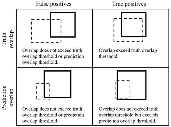 Figure 1. Examples of assessing a model prediction (dashed lines) against a truth annotation (solid line) based on the extent of overlap specified by the truth and prediction overlap parameters. In this example, consider a truth overlap value of 0.5 and prediction overlap value of 0.5. The assessment first considered the truth overlap threshold, and then the prediction overlap threshold. If either the truth or the prediction thresholds are exceeded, the prediction is retained as a true positive. The general flow of this process is depicted schematically in supplemental Figure S2.