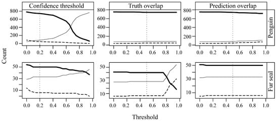 Figure 2. Counts of false positives (dashed lines), false negatives (thin lines), and true positives (thick lines) as a function of confidence threshold (left column), truth overlap (middle column), and prediction overlap (right column) parameters for the penguin (top row) and fur seals (bottom row) data. Data displayed here represent results from the Peng_IR_TC and Seal_IR_TC models. For illustration, we allowed one parameter to vary, whereas the other two remained fixed. Fixed values for the respective panels were set at 0.2 (confidence threshold), 0.5 (truth overlap), and 0.5 (prediction overlap). Vertical dotted lines highlight the thresholds used for analysis of all model predictions.