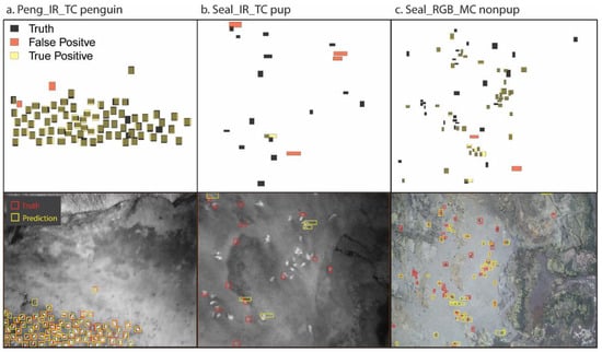Figure 3. Examples of predication and annotation overlap for (a) penguins in the Peng_IR_MC model where most truth annotations are entirely overlapped by predictions, indicating good model performance; (b) pups in the Seal_IR_TC model, where model predictions rarely overlap truth annotations, indicating poor model performance; and (c) non-pups in the the Seal_RGB_TC model, where predications and truth annotations overlap in some areas, but not consistently throughout the image. The upper row shows the annotations split as true and false positives over truth annotations, and the lower panel shows the truth and predicted annotations overlaid on the corresponding images.