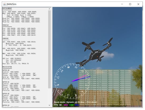 Table 1 shows the sensor properties: GPS interval (GPS_I), GPS Delay (GPS_D), GPS Start time (GPS_S), Accelerometer Noise (Acc_N), Gyroscope Noise (Gyr_N), Magnetometer Noise (Mag_N), and Pressure Sensor Noise (Prs_N), and Table 2 introduces the initial Magnetometer condition, including the set values and their deviations (N: north; E: east; D: down; Incl: Magnetic inclination; Decl: Magnetic declination; H-Magn: Magnetic field strength; T-Magn: Magnetic flux density). Table 3 displays the wind conditions (N: north; E: east; D: down; SET: current wind; DEV: deviation), and, in the beginning of simulations, the airflow speed has been set to zero, which will be adjusted in the wind-resistance-testing section. The final Table 4 gives the home position as well as the gravity setting (LAT: latitude; LON: longitude; ALT: altitude; Grav: Gravity; INIT: initial home position).