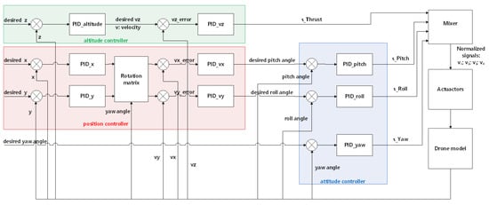 Two predefined proportional-integral-derivative (PID) controllers were chosen as the baseline and compared with SMC. The first PID controller is a pure-position PID controller, which is widely used for the position control of quadcopters [32]. This controller can track the desired attitude, including the pitch, roll, and yaw, based on only position errors. In its control loop, shown in Figure 2, three separate PID modules compare the difference between the current XYZ position values and the desired XYZ position values, and those PID for XY positions help generate the desired rotation angles for roll and pitch. In our simulations, we limit the maximum rotation angle in roll and pitch to 50 degrees. The inputs to the PID controllers are errors in X, Y, Z, , , and . The outputs are virtual control signals , which can be converted to PWM signals in four channels to the motors via the mixer.