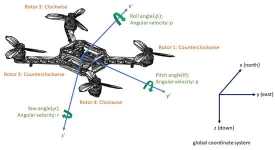 We use the X mode quadcopter drone in PX4, as shown in Figure 4, and NED (north, east, and down) as the global coordinate system. The UAV dynamics equations are expressed as [34]: