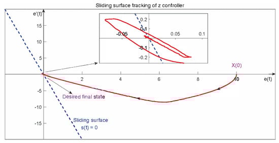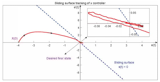 The position controllers of x and y are similar. Figure 6 shows an example of how the system approaches the desired sliding surface. Here the x and y axes are the error e and derivative of error , respectively, and is the initial state, which means there is some error between the initial state and desired state. Naturally, the desired final value should be , which means the error and the derivative of the error must both go to zero, and the system reaches its steady state. Moreover, the blue line is the sliding surface that should be designed, and the system states should approach this line and slide over the line toward .