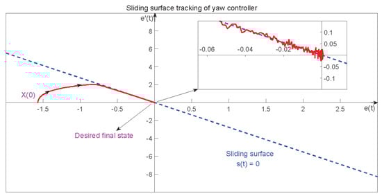 Figure 8 shows how e and approach the sliding surface in the yaw motion in one of the simulation tests. Notice that, because of sensor noise, the state of the system cannot come back to (0,0) perfectly. Therefore, the state will move around the origin with a relatively small error due to noise.