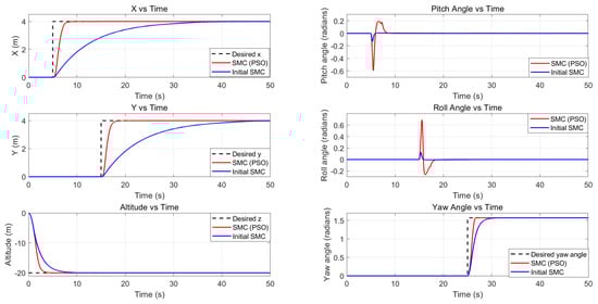 From Equation (12), we can derive that is the sufficient condition for to hold. These are the conditions for stability in the x direction. When optimizing the SMC using PSO in Section 2.4, these conditions will be incorporated into PSO to make sure PSO will optimize the drone dynamics while respecting theoretical stability.