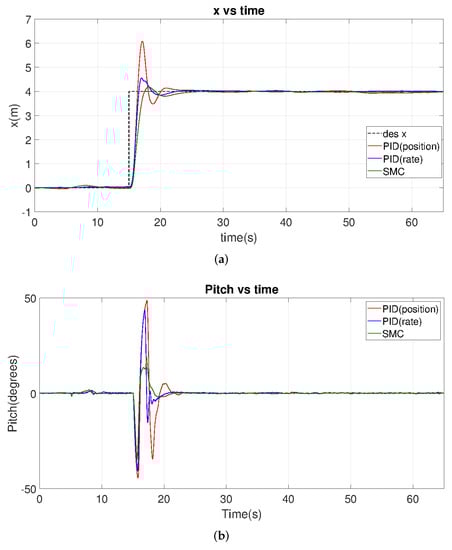 Table 10 summarizes the simulation results, which show the SMC controller has the smallest overshoot and the smallest settling time. Compared to the PID controllers, its rise time becomes slightly longer in the horizontal position (X and Y), but slightly shorter in height and angle (Z and YAW). Furthermore, we analyzed the zoom-in figures of z and yaw motion. The PID-based controllers need a longer time to reach steady states, which leads to a small steady-state error even after a long period of time. In contrast, the SMC UAV does not have many errors, given its IAE, ITAE, ISE, and ITSE values are relatively small. Figure 14 shows that SMC motion has a smaller range and fewer oscillations, and its time derivative is smaller, compared to the PID, especially in terms of pitch and roll tracking. If we assume that smoothness and stability have greater weights in our evaluation, SMC is more preferable.