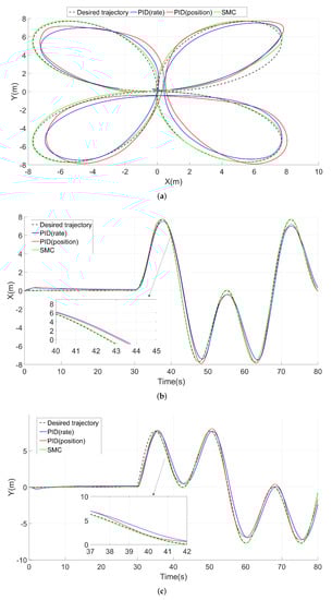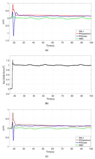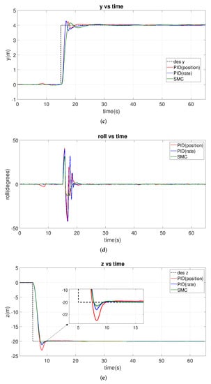 From the top view of Figure 16a, we observe that SMC tracks the desired trajectory during the simulation, while PID-position- and PID-rate-based controllers show notable tracking errors and deviations continuously. Panel a also shows that PID-position produces oscillations around the reference (overshoots and undershoots). On the other hand, from the time trace of x and y in Figure 16b,c, we observe the PID-rate controller has a persistent time delay (about 1 s) compared with SMC and the desired set-points.