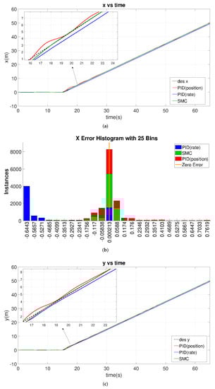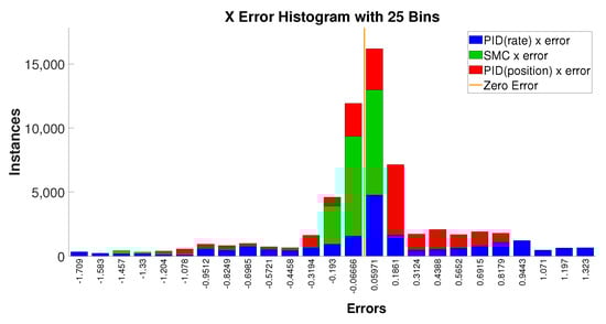 Figure 17 and Figure 18 show the error histograms of the SMC controller and the PID controllers during the flower-pattern trajectory-tracking simulations. These two figures show that the position errors of SMC are mostly concentrated around zero with respect to the both x and y directions, i.e., −0.19 m to +0.06 m in the x direction and −0.08 m to +0.23 m in the y direction; conversely, the position-error distribution of PID controllers is relatively scattered across the range of errors in the histograms. We can observe that SMC responded quicker than the PID controllers from Figure 16 (see when the slope changes in the desired trajectory), and, meanwhile, it produces smaller position-tracking errors as evident in Figure 17 and Figure 18. Therefore, combining the performances of the tracking accuracy and tracking speed, SMC demonstrates superiority over these two PID controllers with respect to complex trajectory tracking.