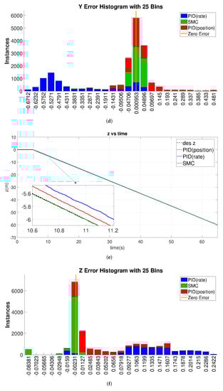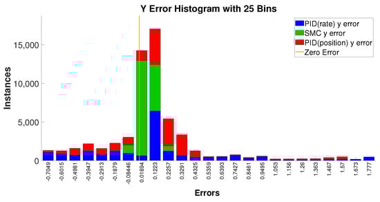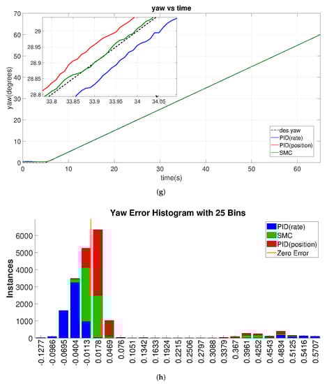 The tracking results for this case study are given in Figure 15, where the error histograms in panels b, d, f, and h show that the PID-rate-based controller design exhibits much larger tracking error (blue bars shift away from the origin in the error histograms). Although the PID-position controller gives a finer tracking performance than the PID-rate, see panels a, c, e, and g, and behaves similarly to the SMC, it is more oscillatory.