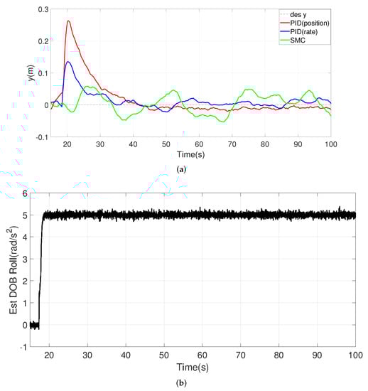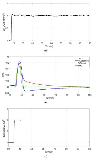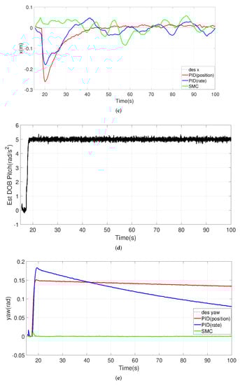 It can be seen that the proposed SMC controller is superior to the other two PID controllers in the face of torque disturbance especially in the yaw direction. The PID-position and PID-rate controllers initially have larger drifts when pitch and roll disturbances are present, although they can slowly stabilize the UAV. These phenomena may cause the UAV to move uncontrollably during takeoff, especially when the center of gravity is not near the center of the UAV. SMC has smaller drifts and corrects faster (see panels a, c, and t < 30 s). In the steady state, however, PID is more acceptable in terms of keeping the tracking error in x and y small. Note that, in the yaw direction, the other two controllers cannot quickly compensate for the disturbance (settling time out of range of the plot), so the PID-rate will slowly return to its original angle, while the PID-position will be slower. On the other hand, SMC is able to use the estimated disturbance information to form active compensation. In the case of circular wind or rotational forces acting on the UAV, SMC controllers with disturbance observers are more sensitive to torque than PID-based controllers, which results in SMC having stronger torque immunity.