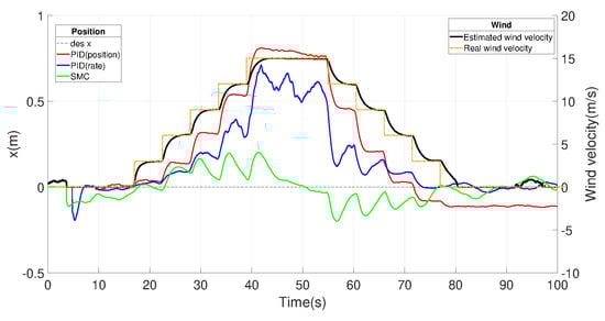 In addition, the wind speed estimated by the disturbance observer is also shown, which matches well with the actual wind-speed magnitude. Due to the symmetry of the UAV, the response on the Y-axis is similar to the response on the X-axis, and the Y-plot is omitted here for clarity. It can be observed from Figure 21 that UAV motion with the SMC controller is concentrated more around the origin than with other controllers; hence, SMC has the best crosswind resistance in terms of position accuracy. This is due to its active disturbance compensation.