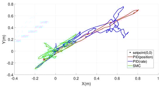 It can be observed that the proposed SMC outperforms the other two PID control methods in terms of tracking accuracy. The benchmark PID-position and PID-rate controllers can stabilize the simulated UAV under PX4 architecture but with a larger overshoot. These phenomena are undesirable in reality, especially when tracking accuracy and stability are required. On the other hand, the proposed SMC can exhibit much improved tracking performance.