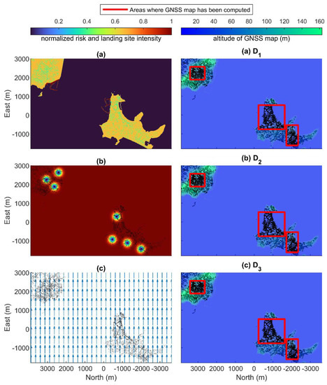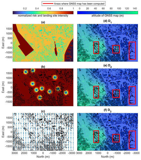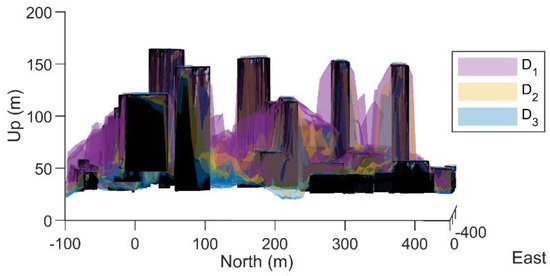 - GNSS coverage maps. GNSS coverage maps are defined with the aim of spatially representing the information about navigation performance, thus avoiding the need to propagate navigation error covariance during the path planning process. Indeed, the navigation performance of the majority of UAVs (which are usually implementing INS/GNSS data fusion) is strictly connected to both the inertial instrument specifics and GNSS coverage. A GNSS coverage map is a 2.5D map connected to the dilution of precision (DOP) level, defining the elevation at which the DOP becomes smaller than a certain threshold. As the GNSS constellation varies as a function of time, a time-varying GNSS coverage map is expected over a selected time interval. The approach followed in the SMARTGO project samples the time interval and defines an elevation map for each sample. The so-defined elevation maps are merged in a worst-case logic to have a constant GNSS coverage map to be used during the whole mission time. Several GNSS coverage maps can be defined as a function of the selected DOP threshold. As an example, Figure 2 shows three GNSS coverage maps obtained over a portion of Naples city center with different colors. It can be noticed that the map’s offset with respect to the buildings reduces as the selected DOP threshold (i.e., Dj) increases. Computing each GNSS challenging map can be very time demanding if a very large scenario is considered. However, in many cases, the need for detailed GNSS coverage maps may arise only in proximity of take-off and landing areas. The approach followed in the SMARTGO project uses this idea, thus estimating the GNSS coverage maps only in the surroundings of the start and the end point and assuming the map altitude is equal to the terrain plus an offset in the other areas.