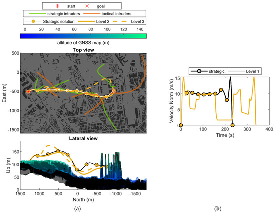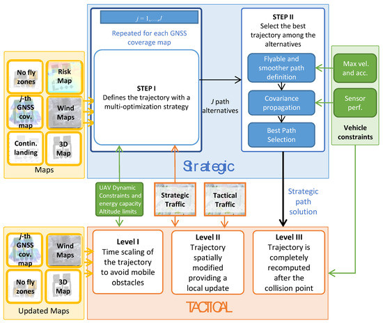 - Level 2 provides spatial modification of the trajectory in the surroundings of the location of the unfavorable event(s). The planner uses a customized version of the RRT algorithm conceived as a global replanner that only provides a local modification of the trajectory because it is informed to return to the strategic path. The global nature of this approach avoids sequential replanning if multiple unfavorable events are experienced by the UAV, thus saving time. Due to the spatial modification of the trajectory, this solution is not only able to deal with both fixed and mobile obstacle geometries, but it can also be used to counteract wind velocity and GNSS coverage maps alteration. The heuristic nature of the RRT makes this solution non-deterministic. In addition, a higher computational time is experienced with respect to the previous approach. However, since only a local modification is provided to the strategic path, its optimality remains almost unaltered while also providing a small increase in flight time, as demonstrated in [16].